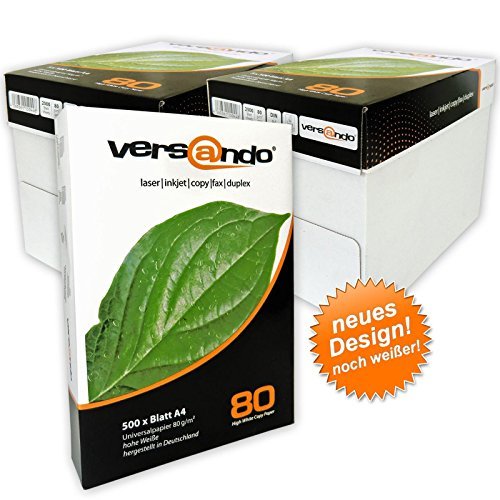 Versando 2500 Blatt Hochwertiges Kopierpapier versando high white 80, DIN A4, 80g/qm, weiß, Druckerpapier, Fax, Laserpapier, Universalpapier, Fotokopierpapier, für Tintenstrahldrucker, aus Nachhaltiger Forstwirtschaft, chlorfrei ECF